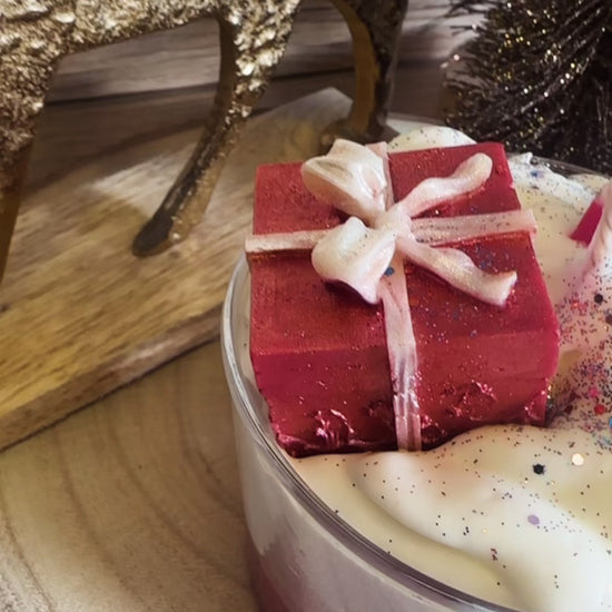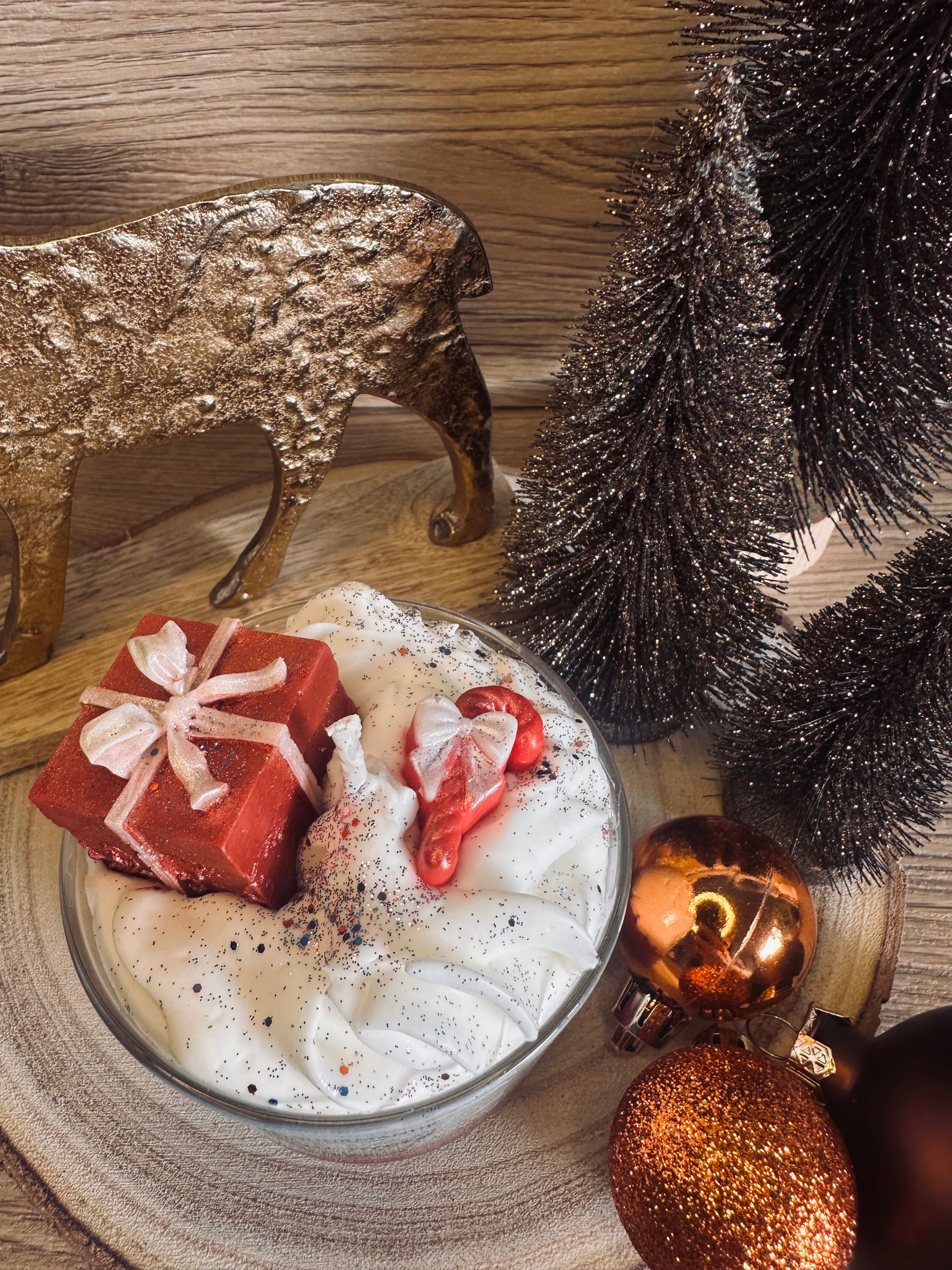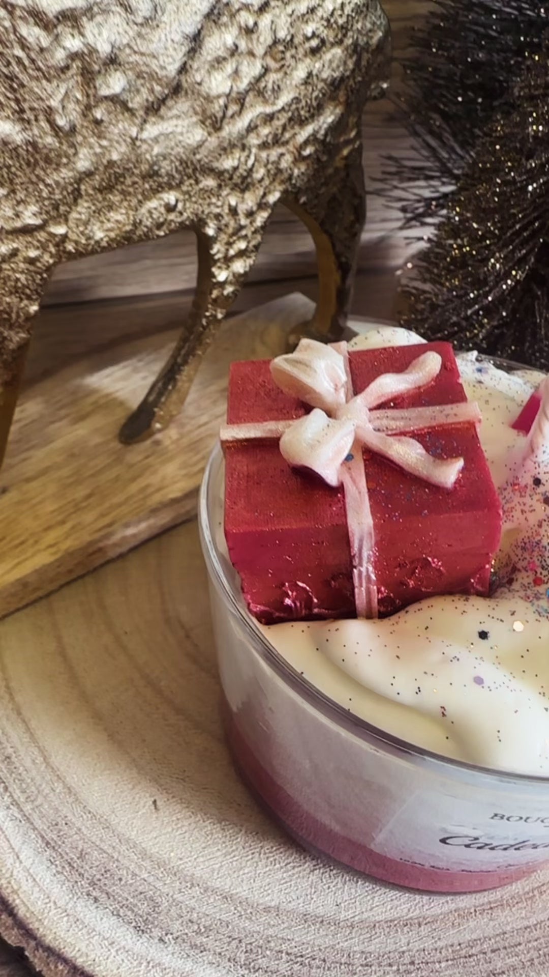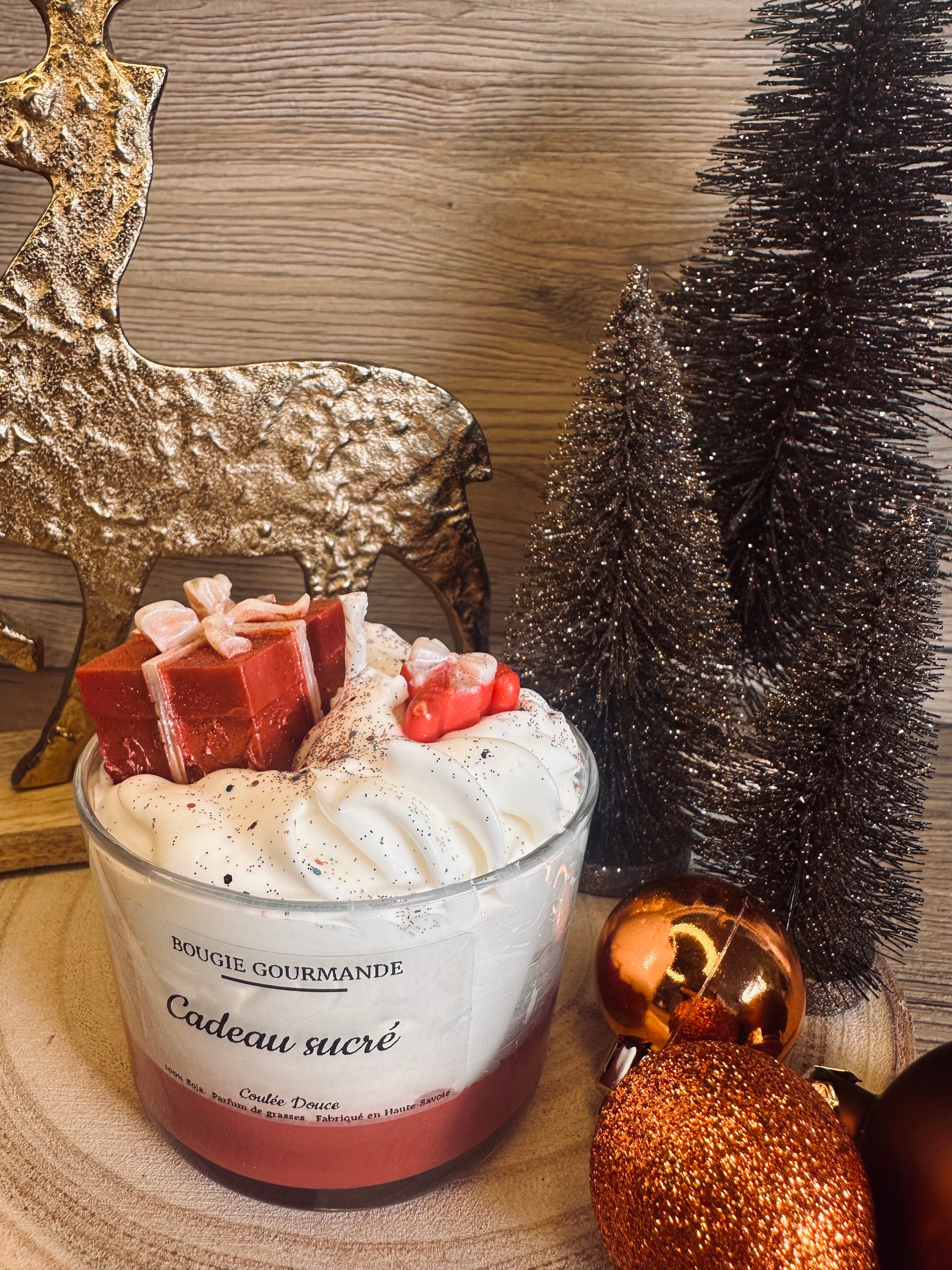 Ma bougie Cadeau Sucré revient dans un décor 100% fête : chantilly généreuse, mini cadeaux rouges, éclats brillants… Et surtout son parfum Pomme d’Amour, sucré et réconfortant, exactement l’odeur des fêtes foraines et des marchés de Noël.