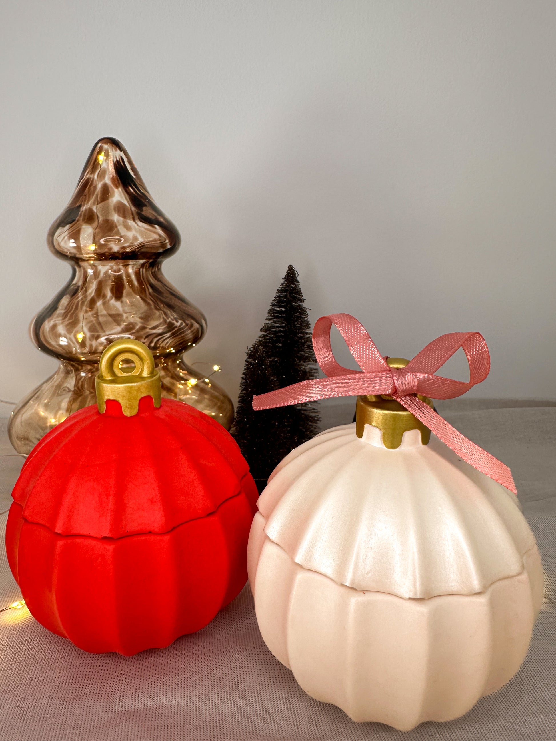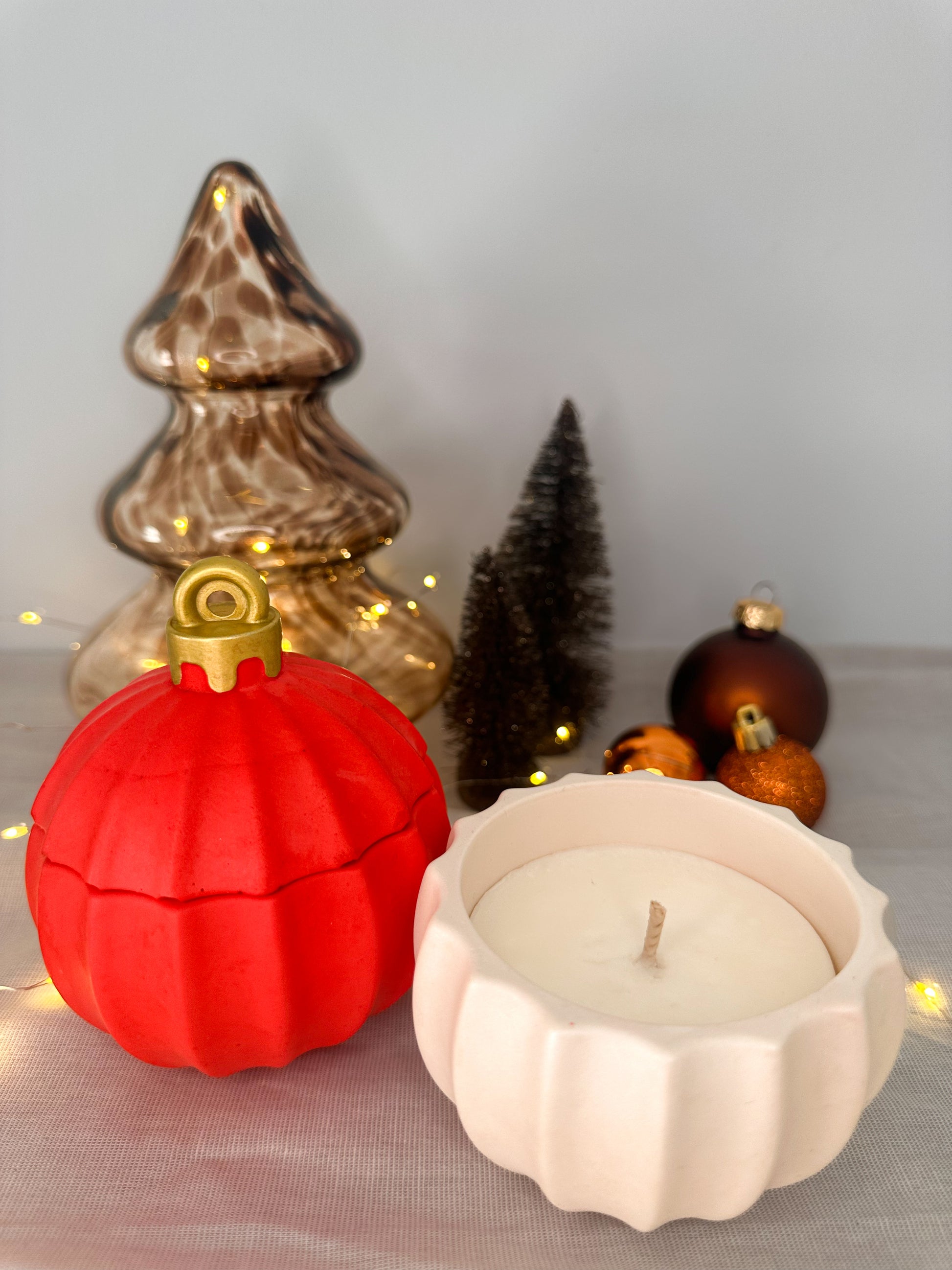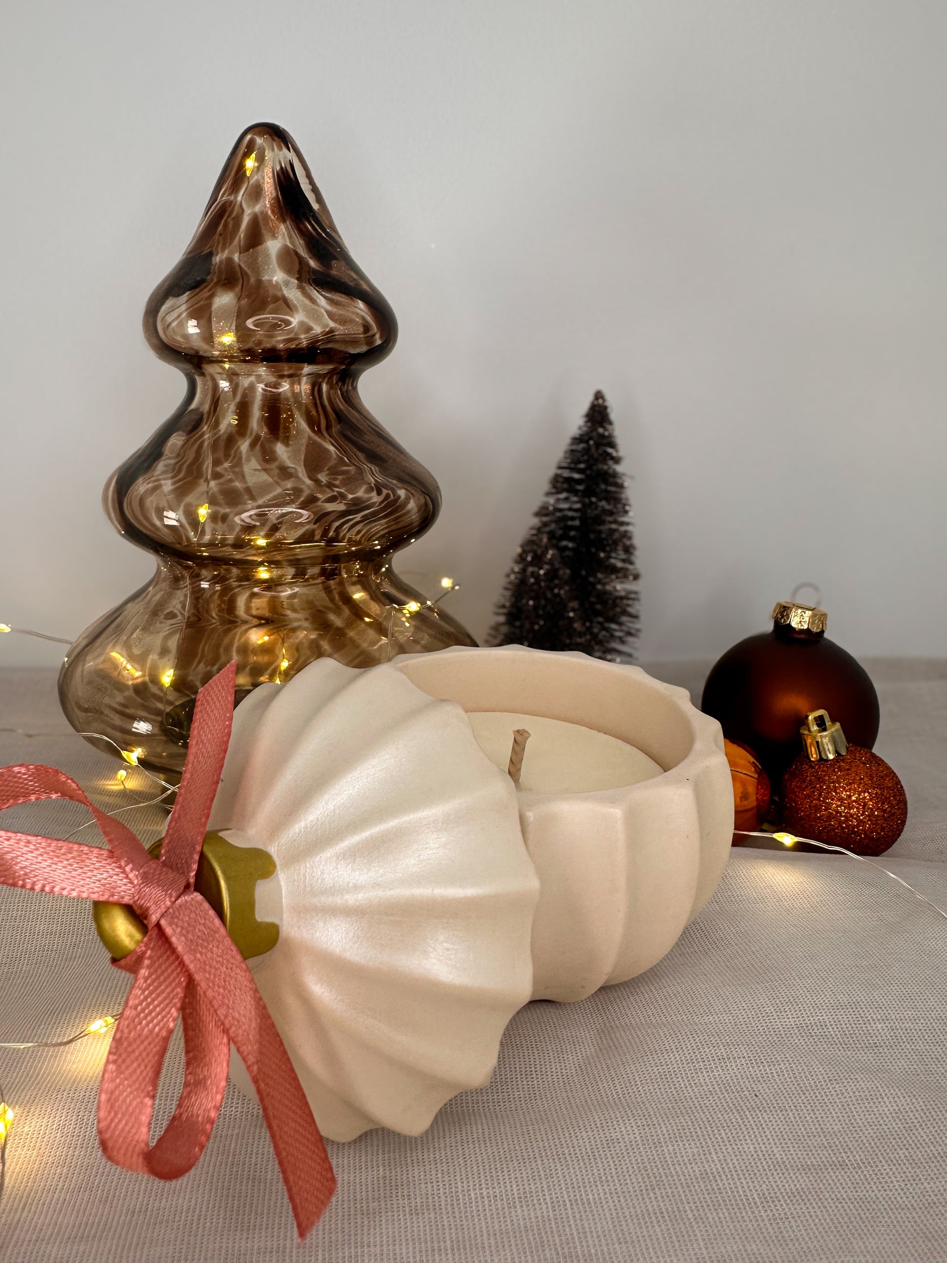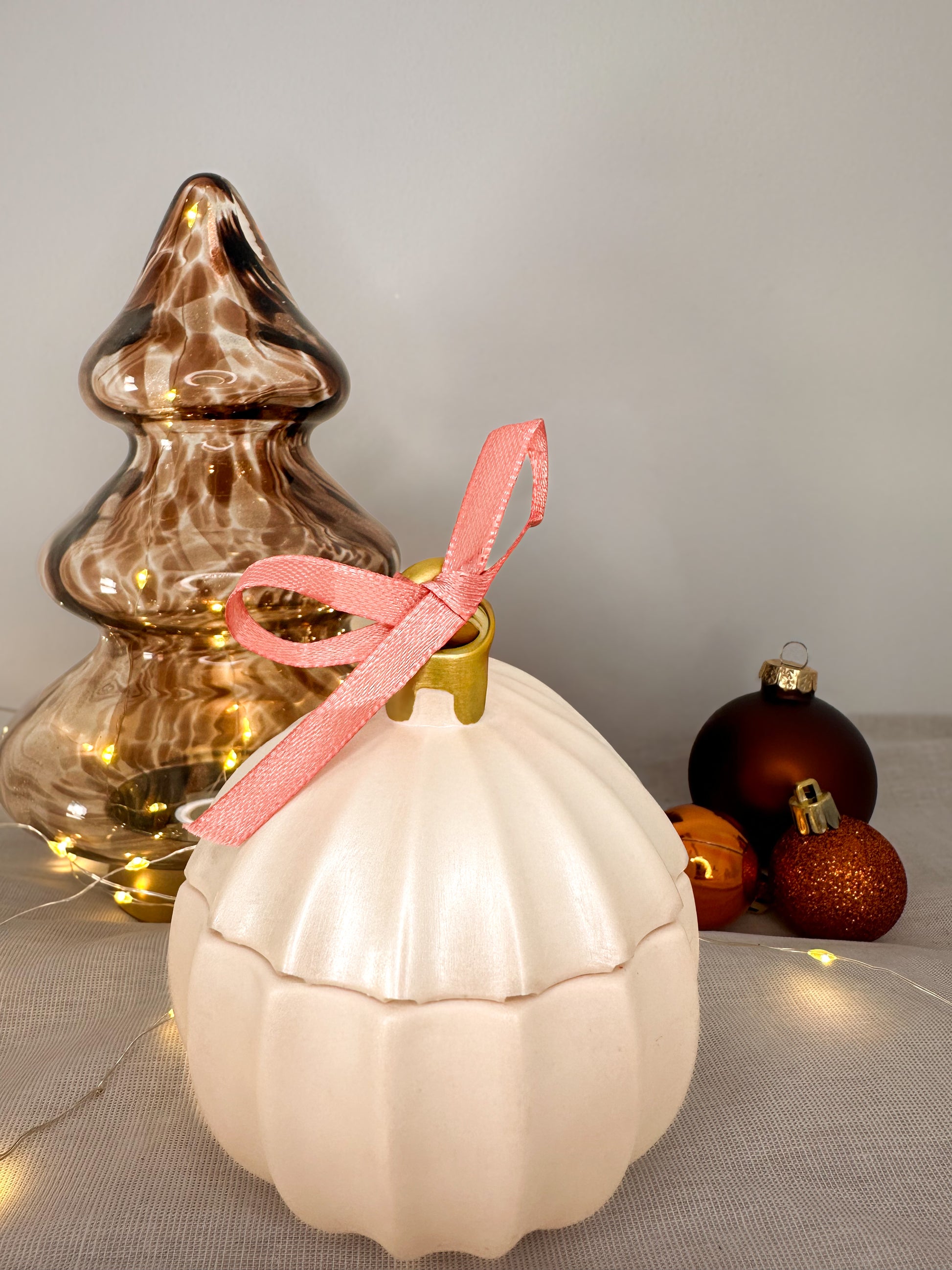 La bougie Douceur d’Hiver dévoile un délicat écrin en jesmonite moulé à la main, inspiré des boules de Noël anciennes. Sa teinte ivoire nacrée et son ruban poudré en font une pièce à la fois chic et poétique.
