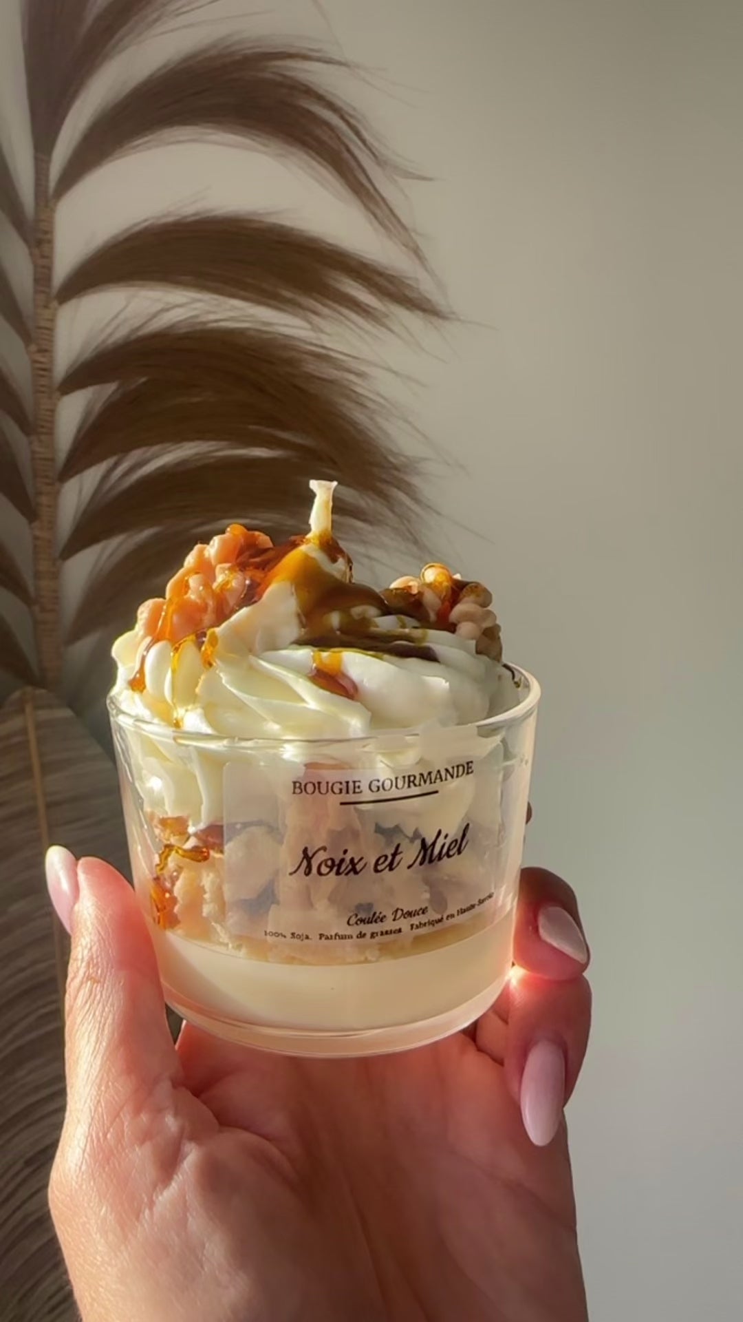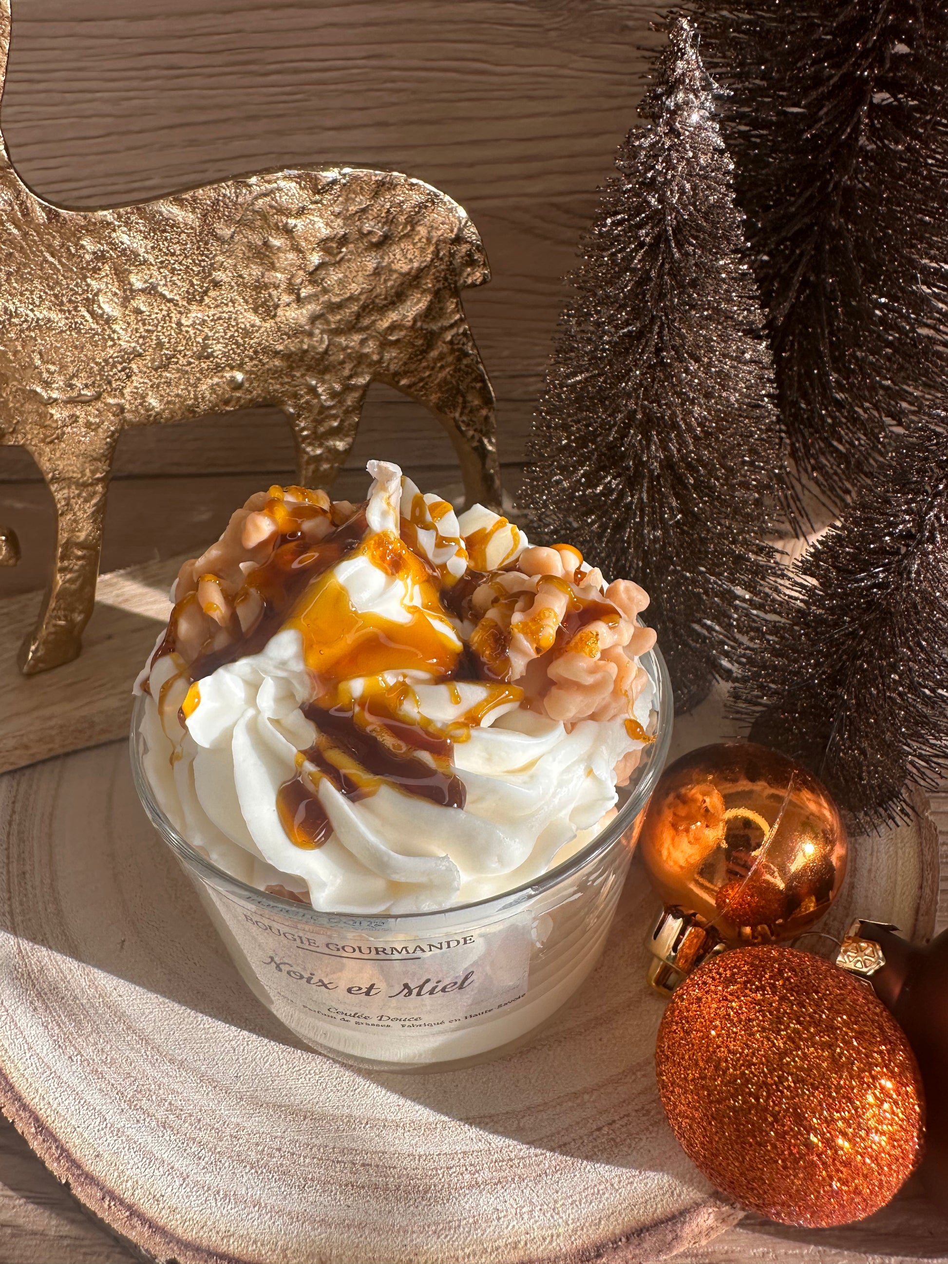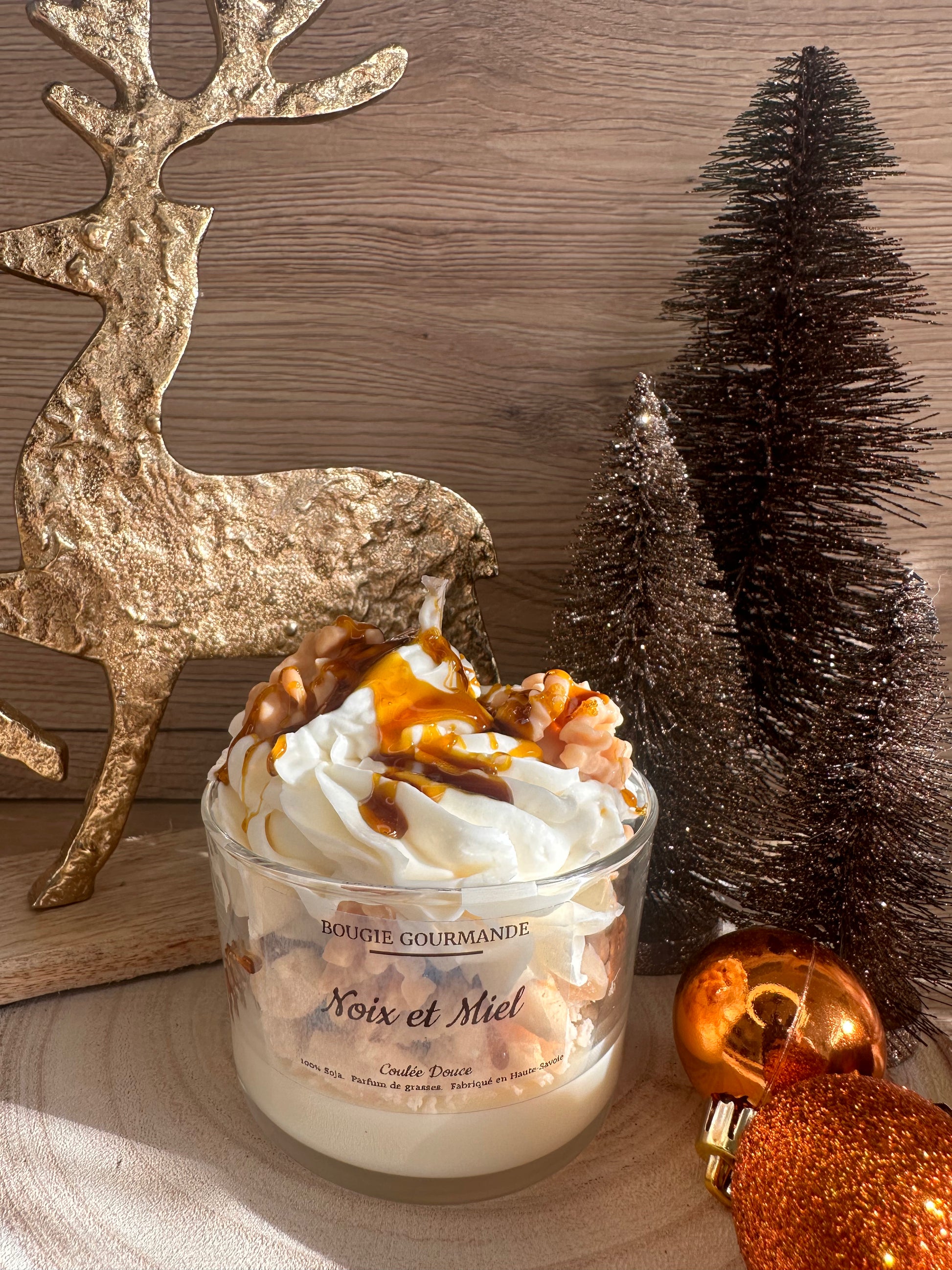 Une création ultra réconfortante qui marie la douceur du miel et le croquant de la noix. Avec sa chantilly généreuse, ses éclats façon crumble et son coulis caramel plus vrai que nature, cette bougie transforme instantanément l’ambiance en cocon chaleureux et sucré.